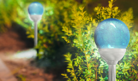 Solar Crackled Globe Path Light \ Stainless Steel & Glass Construction \ Integrated Solar Panel